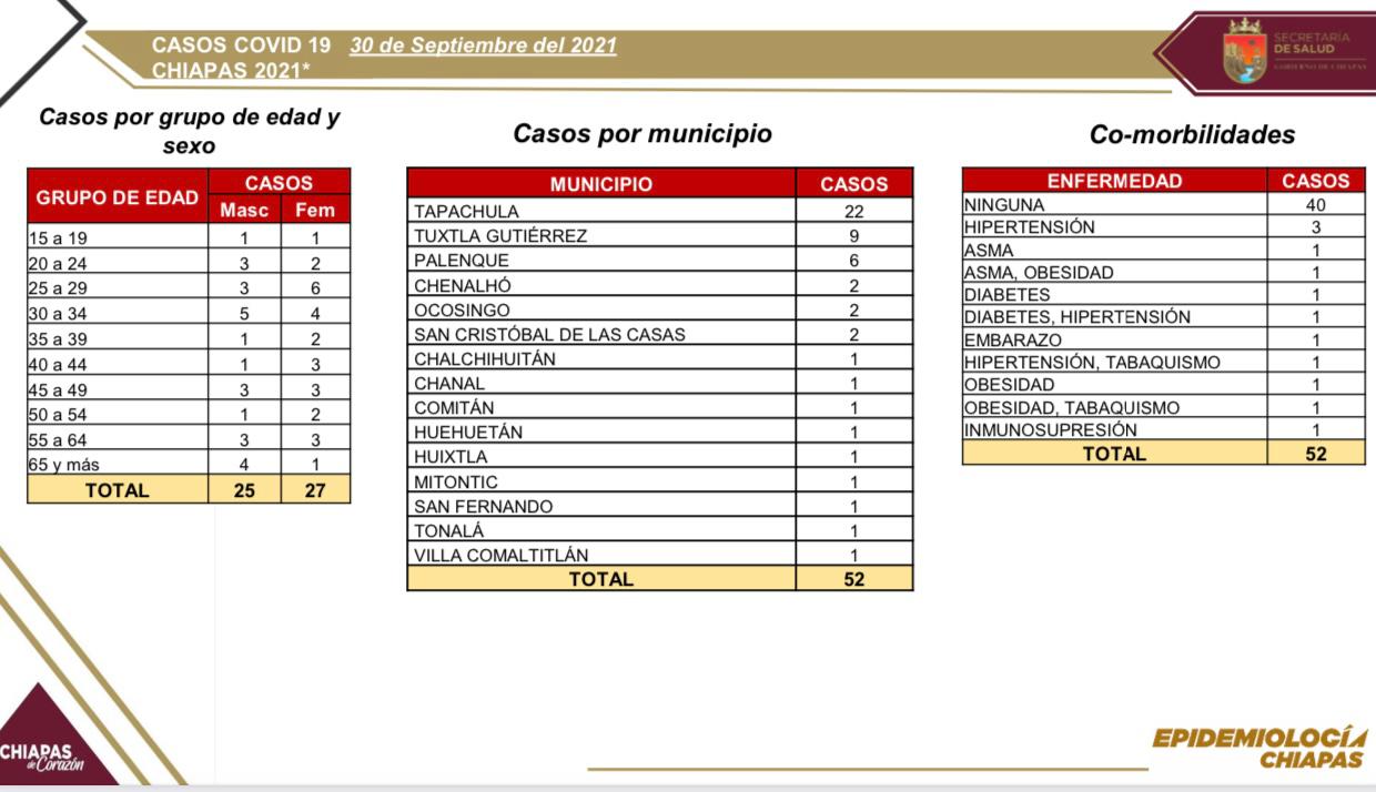 Los contagios nuevos se distribuyen de la siguiente manera: Tapachula con 22; Tuxtla Gutiérrez, nueve; Palenque, seis; Chenalhó, Ocosingo y San Cristóbal de Las Casas, dos cada uno; y Chalchihuitán, Chanal, Comitán, Huehuetán, Huixtla, Mitontic, San Fernando, Tonalá y Villa Comaltitlán, un caso cada municipio.