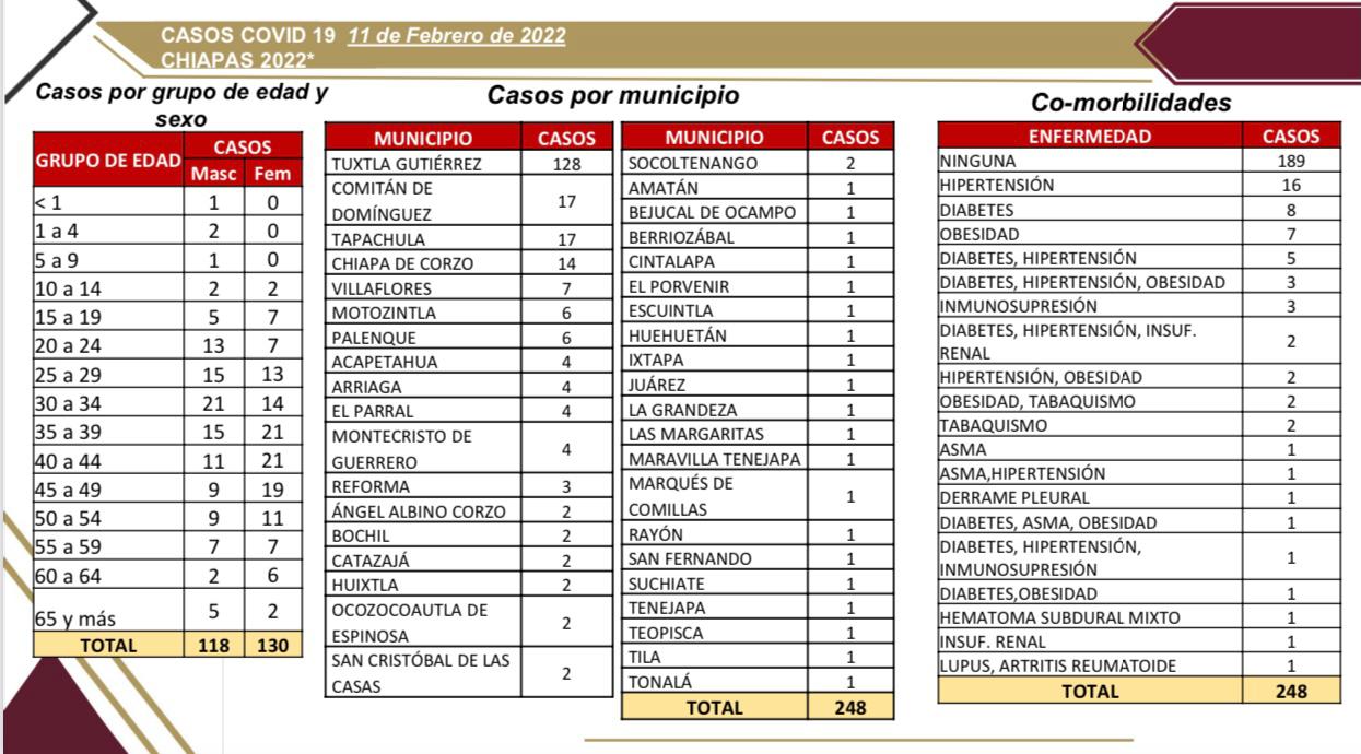 El Laboratorio Estatal de Salud Pública reportó en las últimas horas 248 pruebas positivas de COVID-19, el 52 por ciento de ellas en la ciudad de Tuxtla Gutiérrez (128 casos).