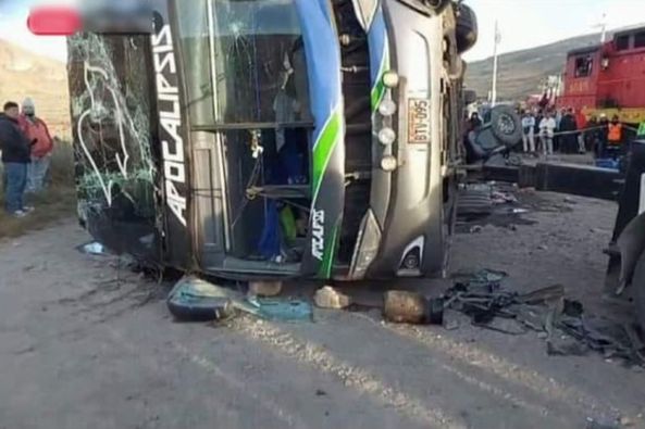 Un trágico accidente ocurrió esta madrugada en la carretera central, cuando un bus de la empresa “Apocalipsis” colisionó con una tren, dejando un saldo de 4 muertos y 33 heridos graves. El siniestro tuvo lugar en el kilómetro 156+650, en la Oroya, Junín.