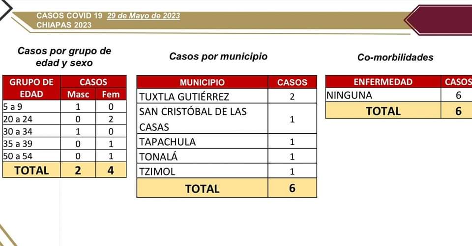 El panorama epidemiológico arroja que los contagios se reportaron en los municipios de Tuxtla Gutiérrez (2), San Cristóbal de Las Casas (1), Tapachula (1), Tonalá (1) y Tzimol (1).