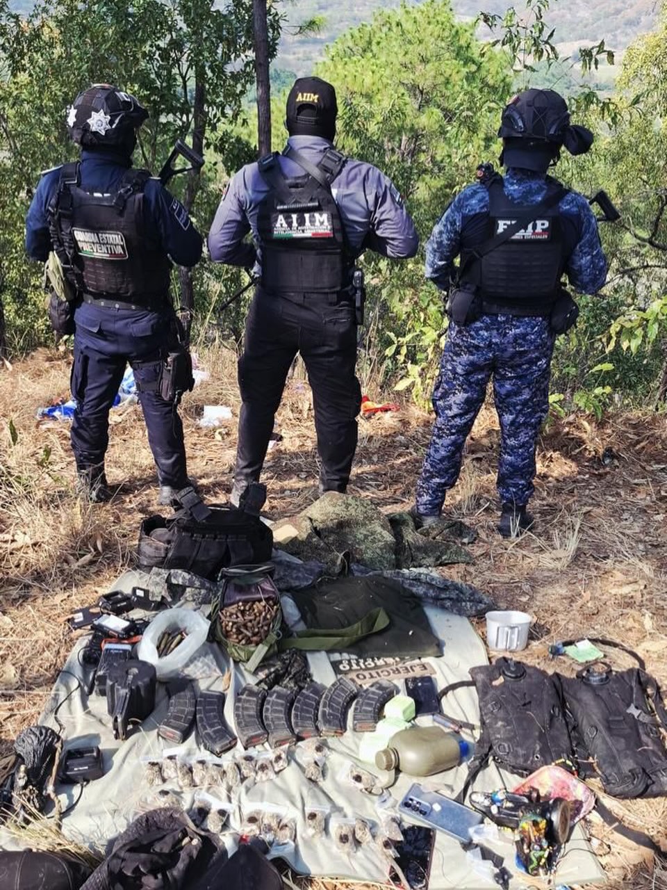 En el lugar se localizó 07 cargadores abastecidos, 668 cartuchos de diferentes calibres, 01 caja de cartuchos 8.62×39, 23 envoltorios, que en su interior contiene una hierba verde y seca con las características de la marihuana, 01 chaleco balístico, 01 cargador de disco, 03 teléfonos celulares, 03 cantinfloras, 04 radios, 02 Camisas tácticas, 02 gorras, 02 gorros y una motocicleta marca Italika.