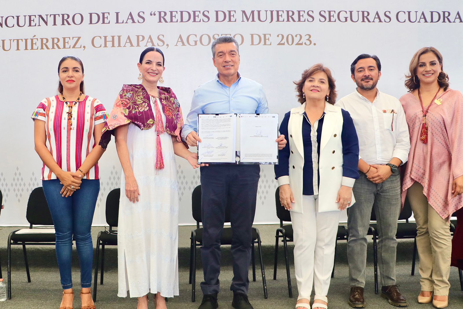 Al atestiguar la firma del acuerdo institucional para la Estrategia Estatal Redes de Mujeres Seguras Cuadra por Cuadra, en el marco de la Estrategia Nacional de Mujeres Constructoras de Paz, destacó que en Chiapas se hace causa común con la Federación para fortalecer las acciones a favor de la recuperación de espacios públicos, el establecimiento de entornos seguros, el combate de la violencia de género y la participación comunitaria femenina en los ámbitos económico, político y social.