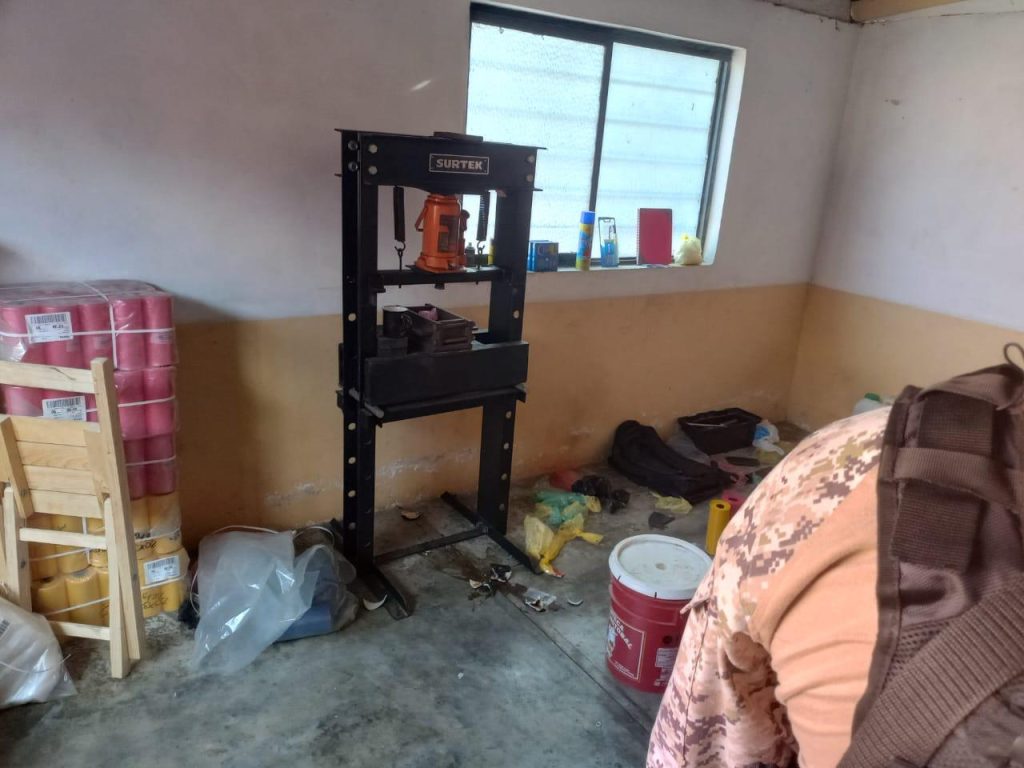 Además, dos vehículos sin reporte de robo marca Peugeot y marca Dodge Dart Volare; dos ánforas con líquido en su interior una de 3.5 litros y la segunda de 20 litros con la leyenda de acetona; una prensa con gato hidráulico y espátula.