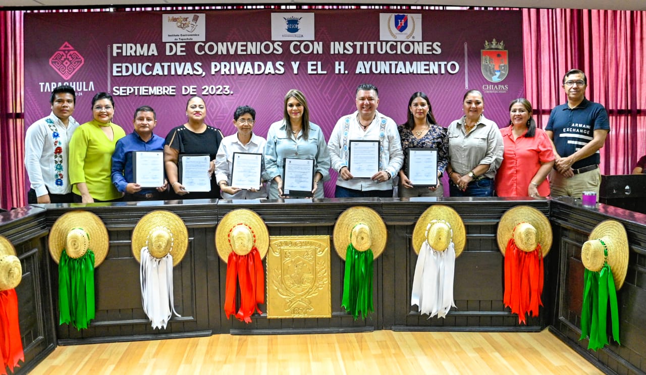 El Ayuntamiento de Tapachula firmó un convenio con tres universidades privadas que permitirán que más jóvenes tapachultecos y de la región del Soconusco puedan continuar con sus estudios profesionales con el otorgamiento de becas.