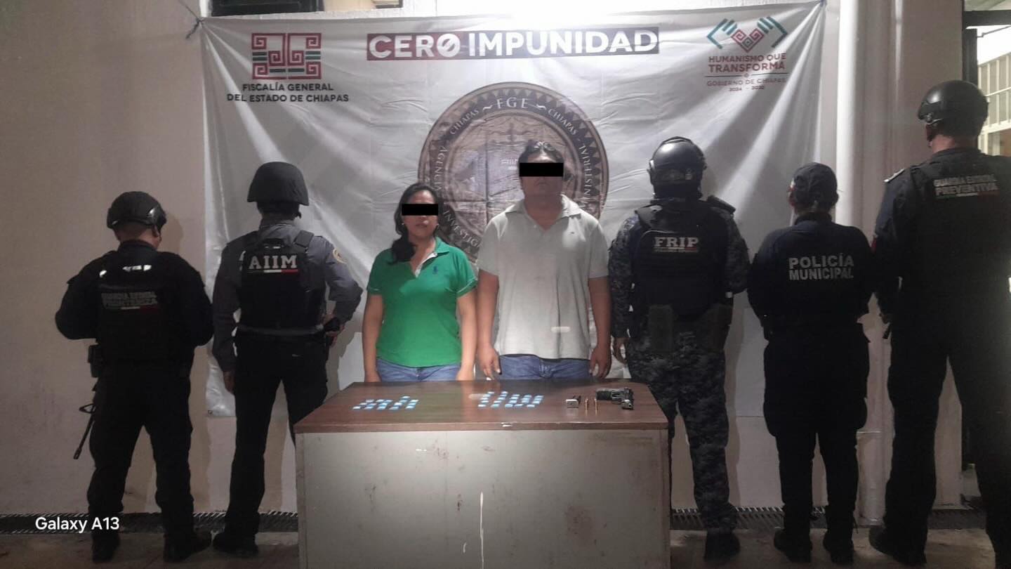 Durante recorridos de prevención y de proximidad social en la 5ª Sur, colonia Centro en dicho municipio, el grupo interinstitucional detuvo a Lenin “N” y Laura “N”, quienes se trasladaban a bordo de una motocicleta marca Hero 160r, logrando el aseguramiento de 38 dosis con sustancia de características del cristal y un arma corta Beretta 92FS, calibre 9 mm, con cargador y 04 cartuchos útiles.