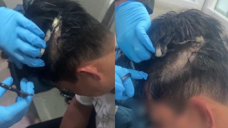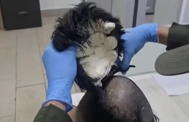 En el video, que ya se ha hecho viral, se puede observar cómo, con unas tijeras, le separan la peluca del cuero cabelludo y, en medio, se encuentra el cargamento de estupefacientes que pretendía transportar hasta los Países Bajos.