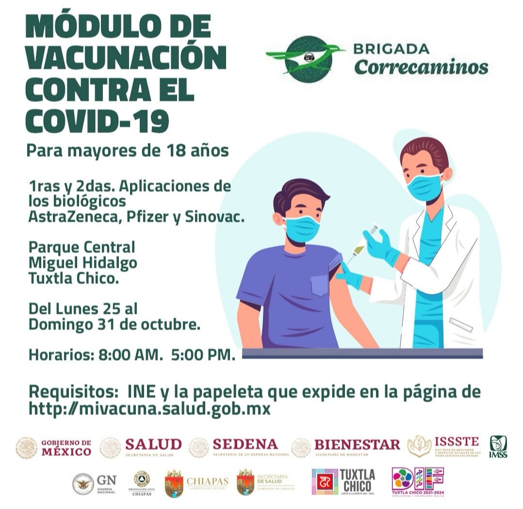 El módulo de vacunación estará ubicado en el parque central Miguel Hidalgo. Los requisitos para recibir la vacuna son acudir con el INE y la papeleta que se obtiene de la página: mivacuna.salud.gob.mx, informó la coordinación de la Brigada Correcaminos Distrito VII.