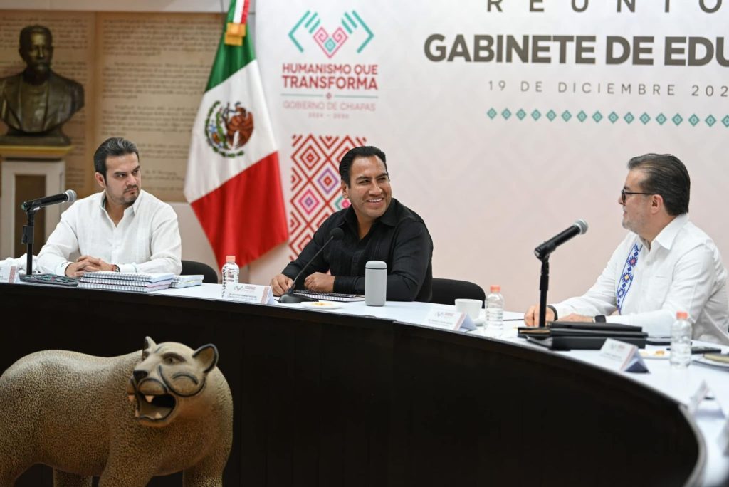 El gobernador Eduardo Ramírez Aguilar sostuvo un encuentro con servidoras y servidores del pueblo que conforman el Gabinete de Educación y Humanismo, donde se llevó a cabo la presentación de los avances de las acciones y estrategias del Programa de Alfabetización “Chiapas Puede”, con el objetivo de educar con humanismo y acabar de raíz con el analfabetismo en la entidad.