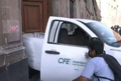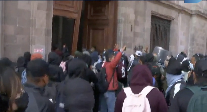 Sin embargo, los manifestantes tomaron una camioneta de la Comisión Federal de Electricidad (CFE) y con ella lograron derribar la puerta de madera del inmueble. Una vez que tiraron la puerta, los manifestantes buscaron ingresar al inmueble, pero personal de seguridad les lanzó gas a los jóvenes para evitar su avance.