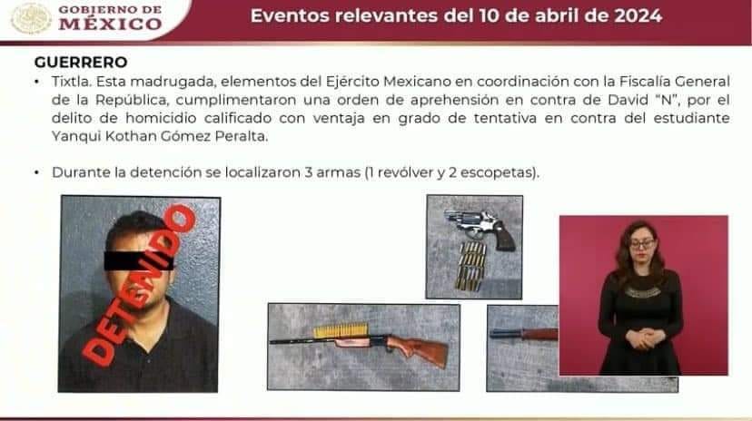 Esta mañana el Presidente Andrés Manuel López Obrador informó que la Fiscalía General de Guerrero detuvo al policía estatal que habría asesinado al normalista Yanqui Kothan Gómez Peralta, el pasado 7 de marzo en Chilpancingo.