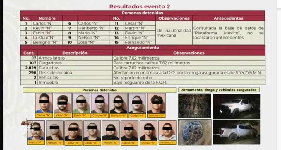 Crescencio Sandoval reportó que los detenidos responden a los nombres de: Carlos N, Kevin N, Esbin N, Cristian N, Benigno N, Carlos N, Heriberto N, Mario N, Nelson N, José N, César N, Martín N, David N, Enrique N y Fernando N.
