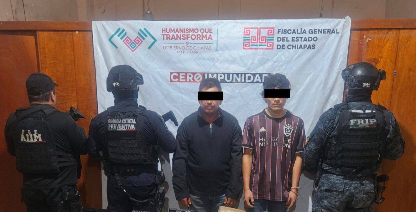 Los elementos de la Agencia de Investigación e Inteligencia Ministerial, el grupo de Fuerza de Reacción Inmediata Pakal y de la Guardia Estatal Preventiva, detuvieron a Ismael “N” y Jesús “N”, como presuntos responsables de los delitos contra la salud, en su modalidad de narcomenudeo en su variante de posesión simple, portación de arma de fuego sin licencia y portación de arma de fuego de uso exclusivo de la Armada y Fuerza Aérea, cometidos en agravio de la sociedad, por hechos ocurridos en el municipio de Mapastepec.