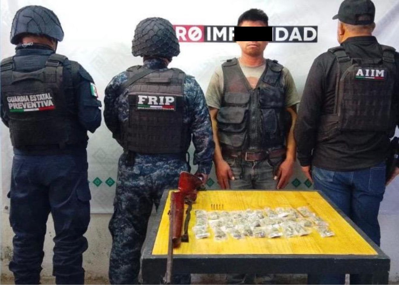 Durante la implementación de patrullajes de prevención, disuasión del delito y proximidad social en el paraje denominado Chancolom, guardias estatales aplicaron control preventivo de detención a Miguel “N”, a quien le aseguraron entre sus pertenencias un arma de fuego larga tipo rifle calibre .22 milímetros, 5 cartuchos útiles y 30 bolsitas de nylón con hierba verde y seca con las características de la marihuana.