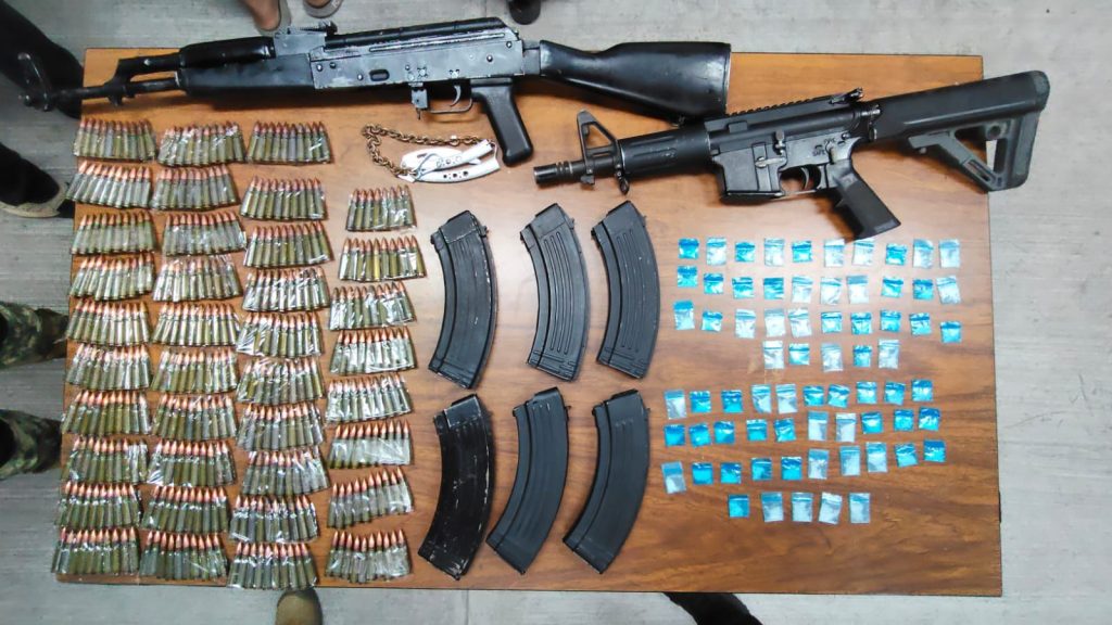 A los masculinos identificados como Alexis “N”, Asael “N”, José “N”, Aarón “N”, Misac “N”, Eliseo “N”, Erick “N” y un menor de identidad reservada, les encontraron entre sus pertenencias 70 bolsitas con material sólido cristalino, 1 arma larga tipo MP-15, 1 arma larga tipo AK47, 6 cargadores para AK47 y 378 cartuchos útiles calibre 7.62 mm.