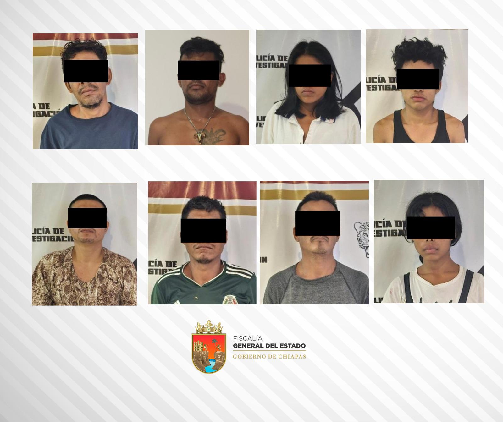 Los presuntos responsables responden a los nombres de Diego “N”, Luis Fernando “N”, Rudy “N”, Hermilo “N”, Sixto “N”, Rey “N”, Luz “N” y Jessenia “N”, mismos que fueron detenidos en las inmediaciones de la colonia Procasa de Tapachula, y puestos a disposición de la Fiscalía de Distrito, órgano que continuará con las investigaciones pertinentes para establecer si se encuentran relacionados con otros delitos cometidos en esta ciudad.