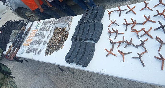 En este acto, la fuerza de seguridad lo logró la detención de José “N”, Berta “N” y Luis “N”, a quienes le aseguraron 3 armas de fuego largas AK-47 con 26 cargadores, 810 municiones, diversos ponchallantas, chalecos, 35 bolsitas que en su interior llevaba hierva verde y seca con las características propias de la marihuana y 12 dosis de presunto cristal.