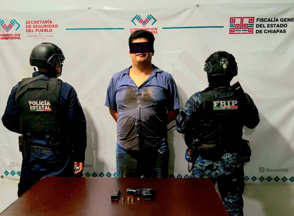 Como parte de la acciones preventivas y disuasivas, la Secretaría de Seguridad del Pueblo (SSP) a través de la Fuerza de Reacción Inmediata Pakal (FRIP) y la Policía Estatal Preventiva (PEP) en coordinación con la Fiscalía General del Estado (FGE) y la Secretaría de Seguridad y Protección Ciudadana (SSPC) del Gobierno Federal, detuvieron a un masculino por el probable delito de violación a la Ley Federal de armas de fuego de uso exclusivo del Ejército y Fuerzas Armadas, en el municipio de Tapachula.
