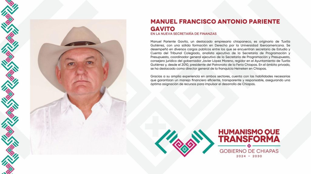 - Manuel Francisco Antonio Pariente Gavito, en la nueva Secretaría de Finanzas.