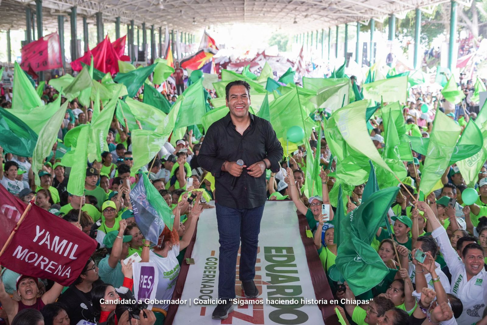 En medio de una fiesta en la que resonaban las letras “Y repican las maderas, se escucha el canto del Quetzal, ya vio venir la nueva era de la Chiapanequidad”, miles de personas acompañaron al candidato a gobernador por la coalición “Sigamos Haciendo Historia en Chiapas”, Eduardo Ramírez Aguilar, en su cierre de campaña electoral en el municipio de Tapachula.