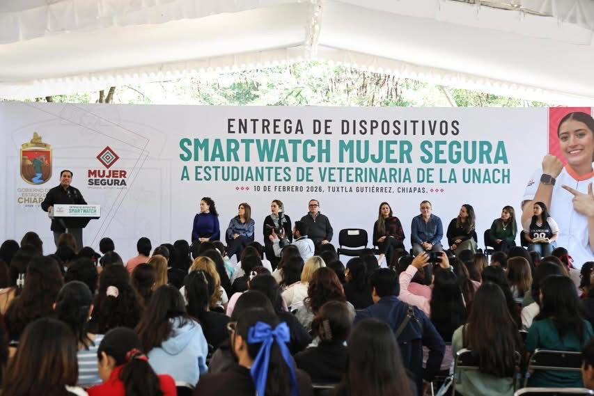 El gobernador Eduardo Ramírez Aguilar encabezó la entrega de dispositivos smartwatch del programa Mujer Segura: Presiona, Activa y Alerta a estudiantes de la Escuela de Medicina Veterinaria y Zootecnia de la Benemérita Universidad Autónoma de Chiapas (Unach), en Tuxtla Gutiérrez. En ese marco, destacó que una de las prioridades del gobierno de la Nueva ERA es garantizar el bienestar, la seguridad, la confianza y el derecho de las mujeres a una vida libre de violencia.