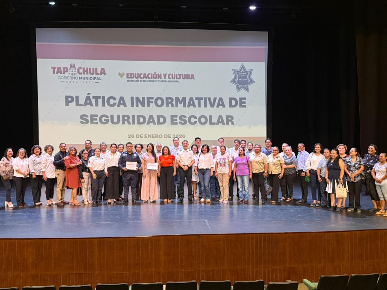 Las Secretarías de Educación y Cultura y Seguridad Pública y Protección Ciudadana Municipal, realizaron la Plática Informativa de Seguridad Escolar, dirigida a directivos y docentes de los niveles básico, medio superior y superior, en el Teatro de la Ciudad “Amparo Montes”, como parte de la estrategia de acercamiento y diálogo con la población, impulsada por el presidente municipal de Tapachula, Yamil Melgar Bravo.