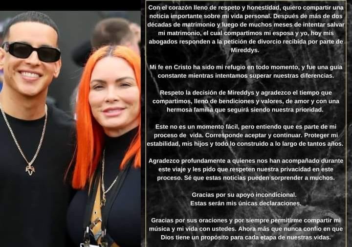 “Después de más de dos décadas de matrimonio y luego de muchos meses de intentar salvar mi matrimonio, el cual compartimos mi esposa y yo, hoy mis abogados responden a la petición de divorcio recibida por parte de Mireddys.