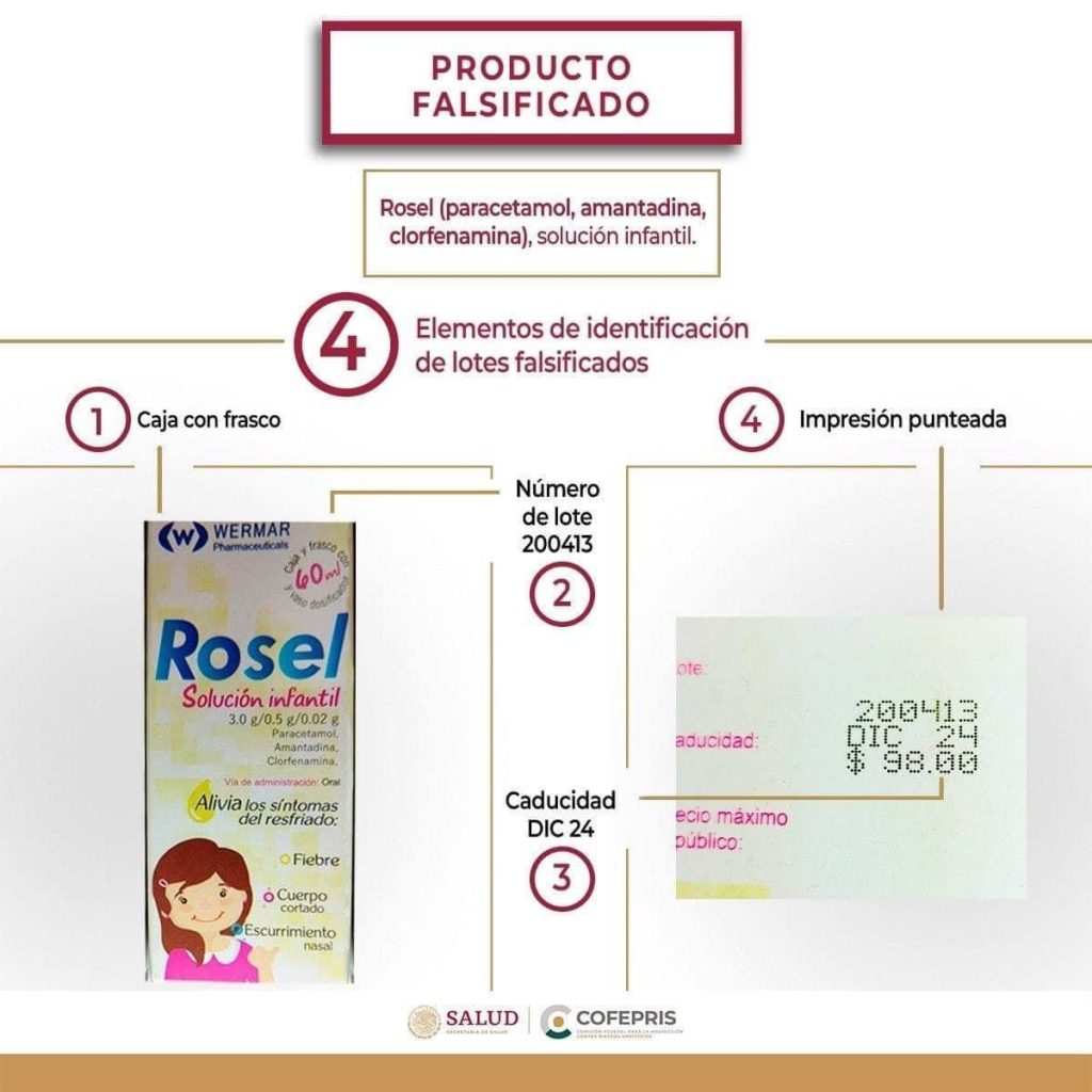 Explicó que los dos medicamentos antigripales son Desenfriol-ito plus, con el número de lote X23V7X y fecha de caducidad falsificado diciembre del 2023 ya que dejaron de producirlo en abril del 2021; así como el jarabe Rosel solución infantil, con el número de lote 200413 diciembre 2024, el cual caducó originalmente en mayo de 2022.