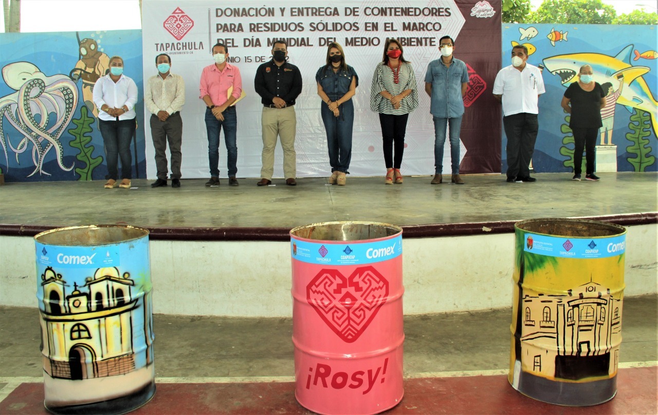 La presidenta municipal de Tapachula, Rosa Irene Urbina Castañeda, el director general del Instituto Estatal del Agua, Roger Efraín Ruiz Gómez y el gerente Comercial de COMEX, Enrique Mitzuí Gálvez, encabezaron la donación de 60 contenedores de basura a empresarios palaperos de Puerto Madero, en donde hicieron un llamado conjunto a cuidar la salud y el equilibrio del planeta para proteger el presente y el futuro de las nuevas generaciones.