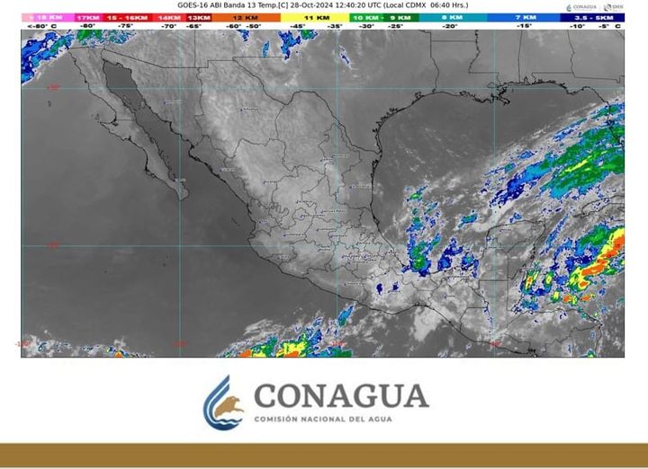 Hoy, se pronostican lluvias puntuales muy fuertes (de 50 a 75 milímetros [mm]) en Chiapas, Oaxaca, Quintana Roo, Tabasco y Veracruz; fuertes (de 25 a 50 mm) en Campeche, Guerrero y Yucatán; intervalos de chubascos (de 5 a 25 mm) en Baja California, Ciudad de México, Estado de México, Michoacán, Morelos, Hidalgo, Puebla, Tamaulipas y Tlaxcala, y lluvias aisladas (de 0.1 a 5 mm) en Colima, Guanajuato, Jalisco, Querétaro, San Luis Potosí y Sonora.