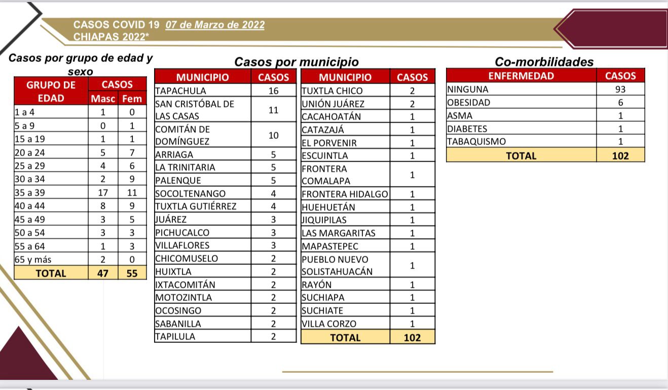 Los casos positivos se distribuyen en los municipios siguientes: Tapachula, 16; San Cristóbal de Las Casas, 11; Comitán, 10; Arriaga, la Trinitaria y Palenque, cinco cada uno; Socoltenango y Tuxtla Gutiérrez, cuatro cada uno; Juárez Pichucalco y Villaflores, tres cada uno; Chicomuselo, Huixtla, Ixtacomitán, Motozintla, Ocosingo, Sabanilla, Tapilula, Tuxtla Chico y Unión Juárez, dos cada uno.
