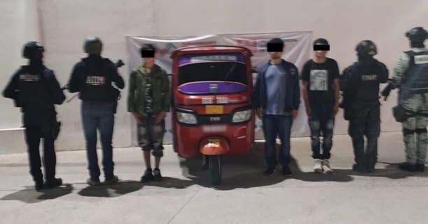 Además, de una pistola tipo revólver de color negro con cacha de color blanco, calibre .22, y 8 cartuchos útiles de color plateado, calibre .22. También se aseguró un vehículo tipo mototaxi, marca TVS, sin placas de circulación.