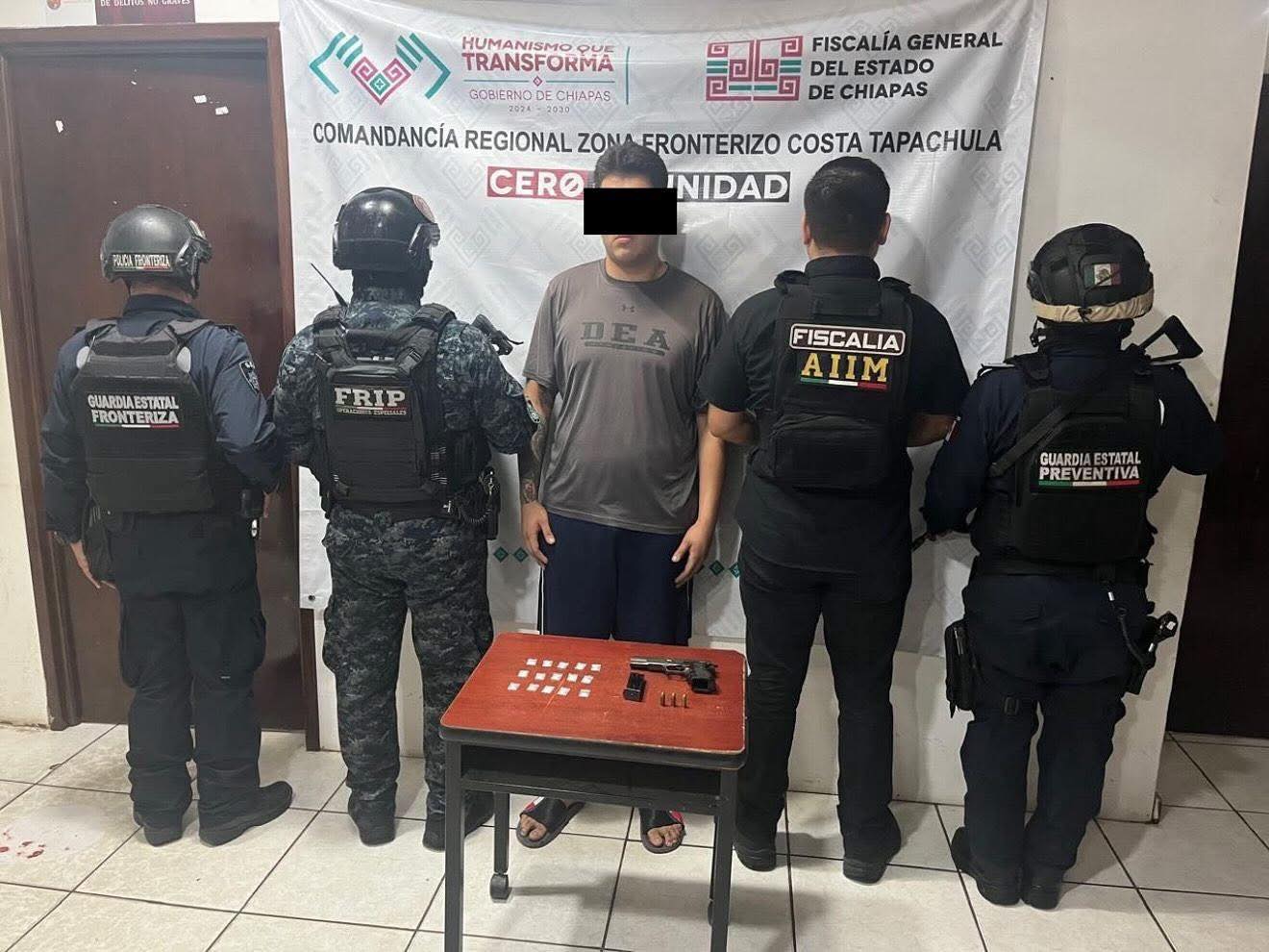 La Secretaría de Seguridad del Pueblo (SSP) a través de la Fuerza de Reacción Inmediata Pakal (FRIP), la Guardia Estatal Preventiva y la Guardia Estatal Fronteriza, en coordinación con la Agencia de Investigación e Inteligencia Ministerial (AIIM) de la Fiscalía General del Estado (FGE) y la Secretaría de Seguridad y Protección Ciudadana (SSPC) del Gobierno Federal, detuvieron con presuntos narcóticos y arma de fuego a un masculino en el municipio de Tapachula.