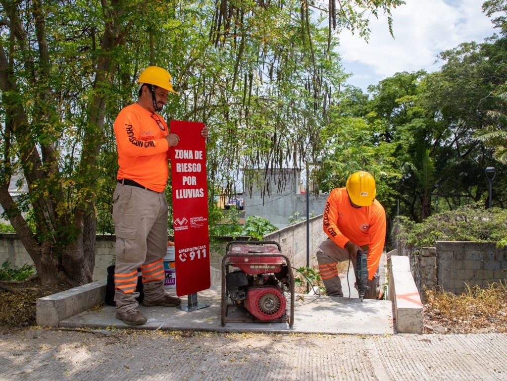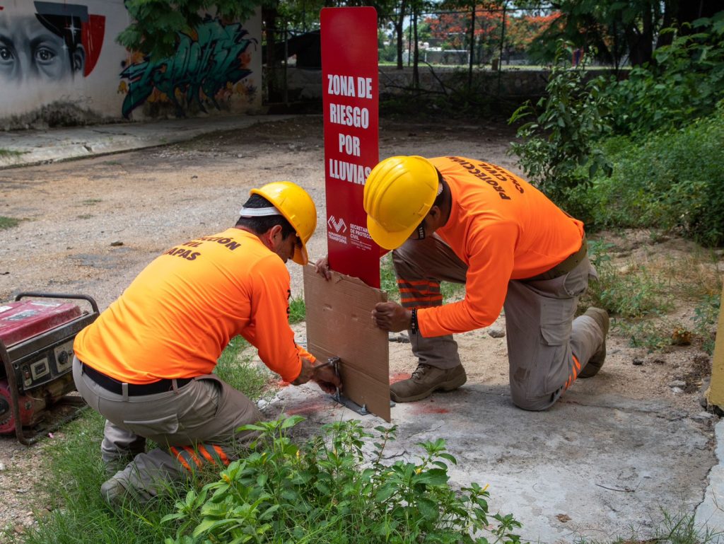 En Tuxtla Gutiérrez, Protección Civil Chiapas coloca señalamientos pluviales preventivos en zonas de riesgo de inundación
