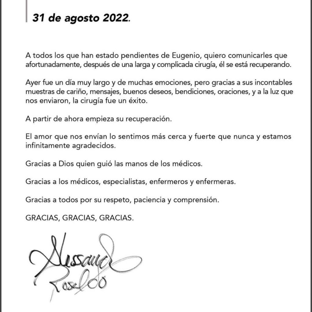 “A todos los que han estado pendientes de Eugenio, quiero comunicarles que afortunadamente, después de una larga y complicada cirugía, él se está recuperando”, se lee en el comunicado.