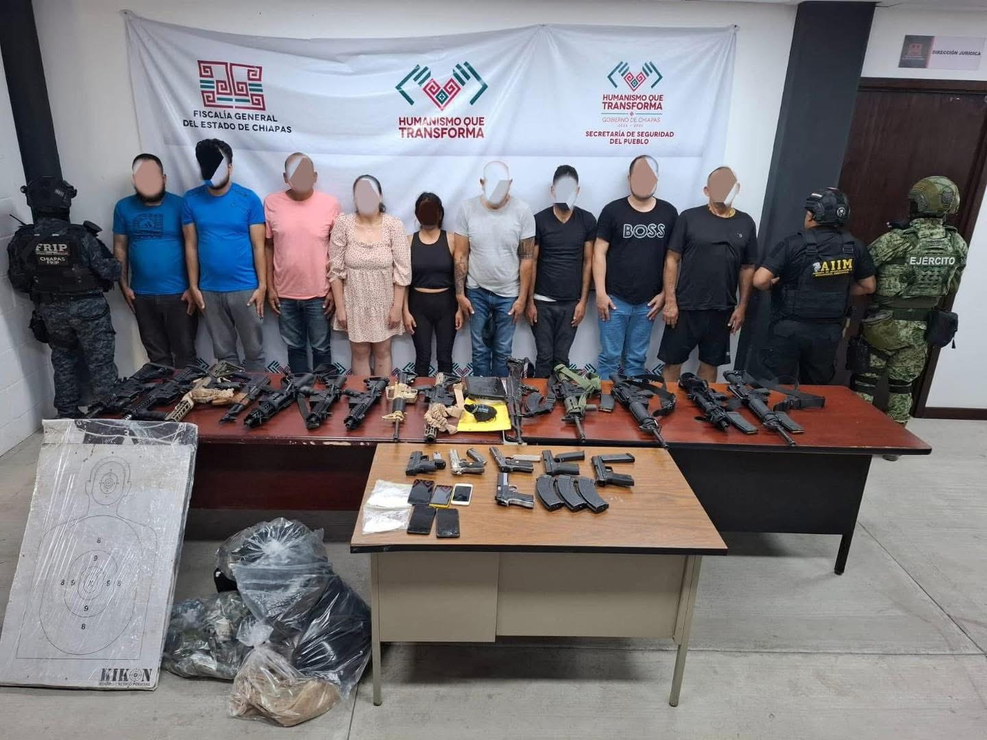 Elementos de la Fiscalía General del Estado, de la Secretaría de Seguridad del Pueblo y de la Secretaría de la Defensa Nacional, realizaron diligencias de cateo a dos inmuebles, derivados de presuntos actos de privación ilegal de la libertad, donde se detuvo a 10 personas, un arsenal de armas y vehículos.