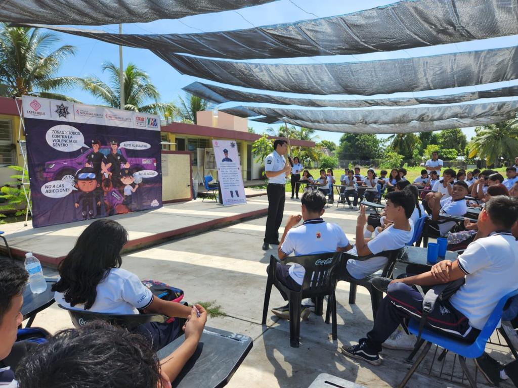 El Ayuntamiento de Tapachula a través de la Secretaria de Seguridad Pública y Protección Ciudadana Municipal (SSPyPCM), continúa llevándose a cabo el programa “Jornadas de Prevención y Seguridad en Escuelas” con el apoyo de la Coordinación de Prevención del Delito, en instituciones educativas de la localidad.