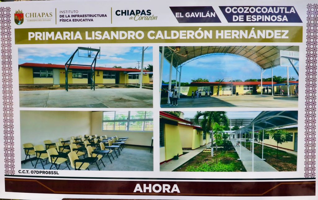 En un ambiente de fiesta para la niñez de la localidad El Gavilán, del municipio de Ocozocoautla, el gobernador Rutilio Escandón Cadenas inauguró la construcción de aulas didácticas de la Escuela Primaria Lisandro Calderón Hernández, donde aseguró que estas acciones patentizan el trabajo institucional, humano y responsable de todas las autoridades a fin de que este espacio cuente con infraestructura digna y adecuada para el fortalecimiento del proceso de enseñanza-aprendizaje.