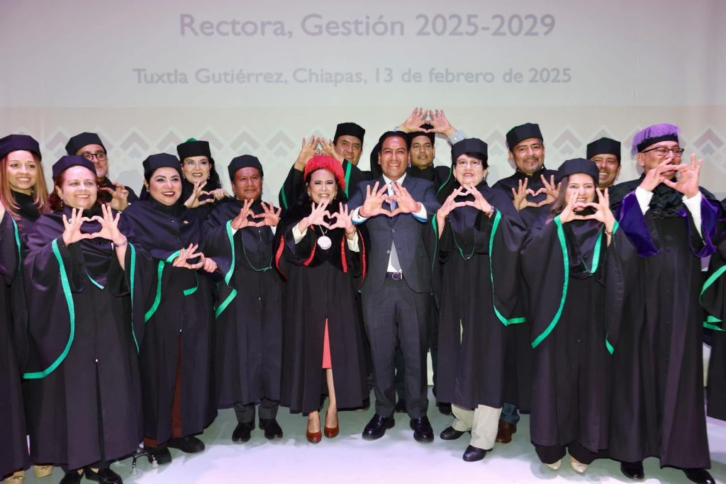 La ceremonia contó con la presencia del gobernador de Chiapas, Eduardo Ramírez Aguilar, quien destacó la coincidencia de que una mujer, la segunda en la historia de la Unicach, sea quien conduzca los destinos de dicha institución, en un contexto nacional en el que México es gobernado por la presidenta Claudia Sheinbaum Pardo.