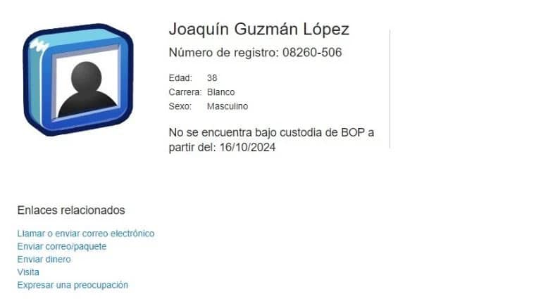 Joaquín Guzmán López, hijo del narcotraficante Joaquín «El Chapo» Guzmán, ya no se encuentra bajo la custodia del Buró Federal de Prisiones (BOP) de Estados Unidos. De acuerdo con los registros de la institución, al buscar su nombre o su número de interno (08260-506), se indica que «no está en custodia del BOP a partir del 16 de octubre de 2024». Hasta el momento, se desconoce su paradero actual.