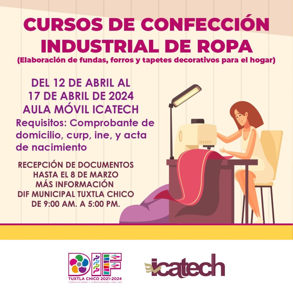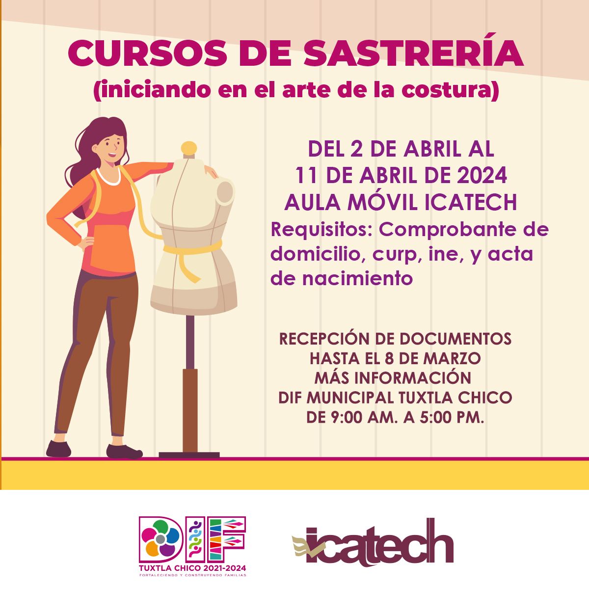Tuxtla Chico, Chiapas a 22 de febrero de 2024. Con el fin de expandir las posibilidades de aprendizaje y con ello emprender un negocio; el Sistema Municipal DIF Tuxtla Chico en coordinación con el Instituto de Capacitación y Vinculación Tecnológica del Estado de Chiapas (Icatech) invita a las personas mayores de 15 años a tomar los cursos de Sastrería (iniciando en el arte de la costura) el cual se llevará a cabo del 2 al 11 de abril