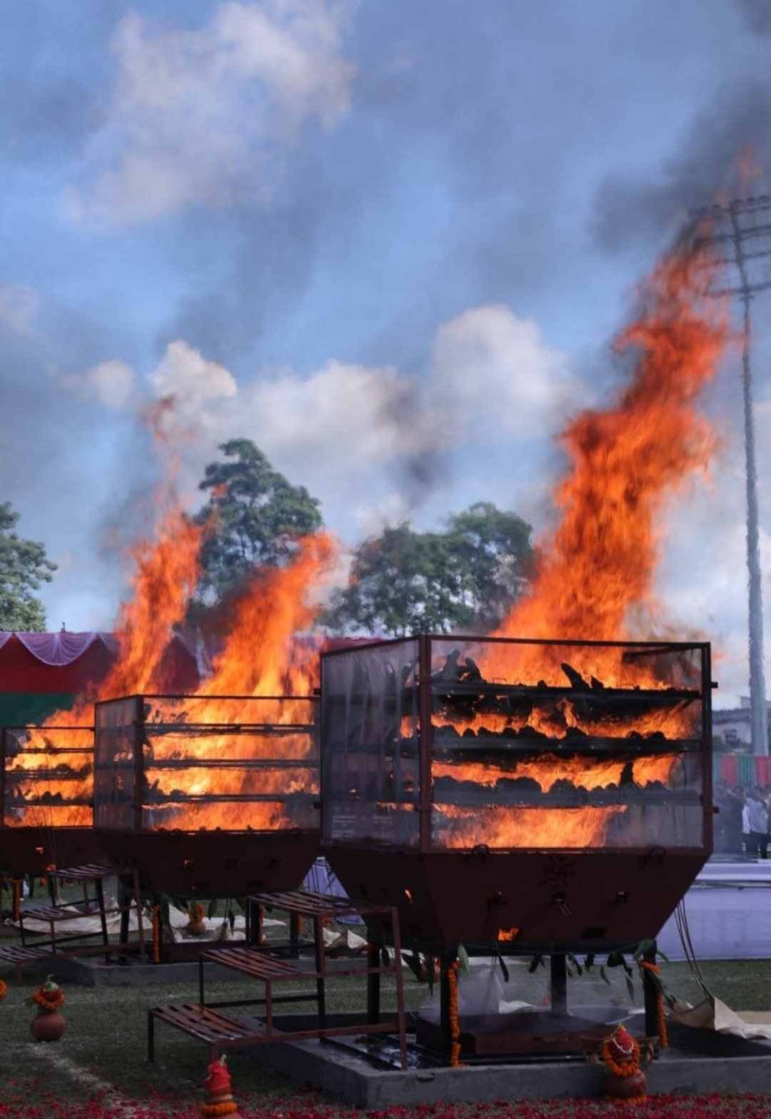 Los funcionarios indios quemaron los cuernos en presencia de un destacado grupo de autoridades y docenas de sacerdotes hindúes, en un estadio deportivo cerca del famoso Parque Nacional Kaziranga.