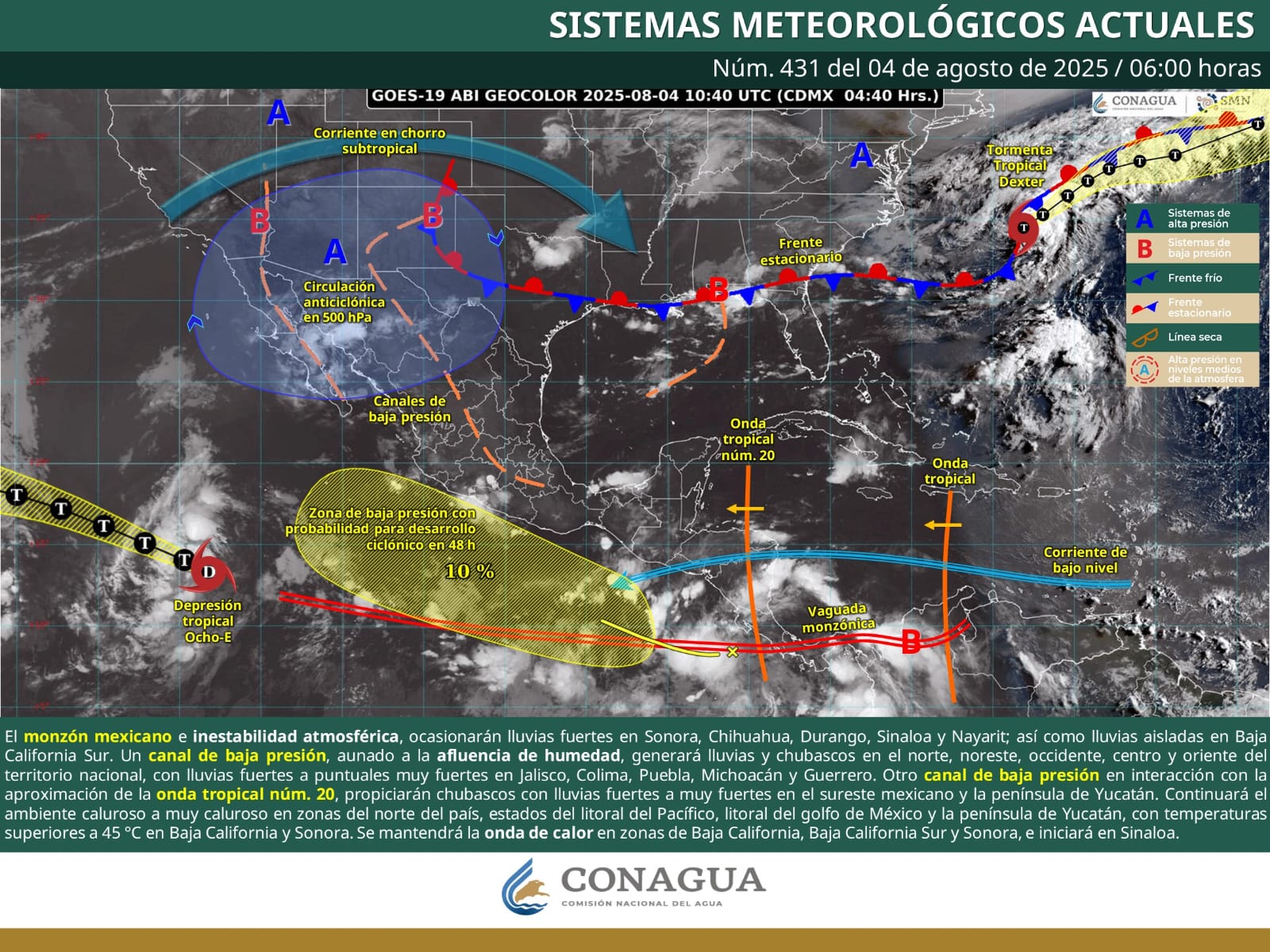 Asimismo, continuará el ambiente caluroso a muy caluroso en zonas del norte del país, estados del litoral del Pacífico, litoral del golfo de México y la península de Yucatán, con temperaturas superiores a 45 °C en Baja California y Sonora. Finalmente, se mantendrá la onda de calor en zonas de Baja California, Baja California Sur y Sonora, iniciando a partir de este día en Sinaloa. Esta madrugada se formó la depresión tropical Ocho-E del océano Pacífico, sin representar peligro para las costas nacionales.