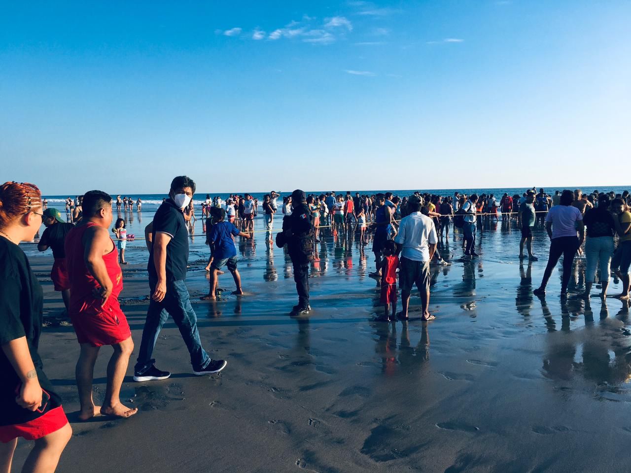 Elementos de Fuerza Ciudadana de la Secretaría de Seguridad y Protección Ciudadana (SSyPC) brindan apoyo a biólogos de Puerto Arista, municipio de Tonalá, con la finalidad de establecer un dispositivo de seguridad, mientras las autoridades atienden el hallazgo de una ballena al parecer sin vida.