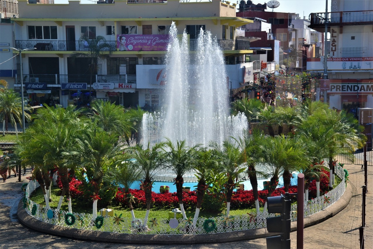 La fuente central del parque Miguel Hidalgo, también se adornó con flores de pascua, para imponer un toque navideño durante esta temporada.