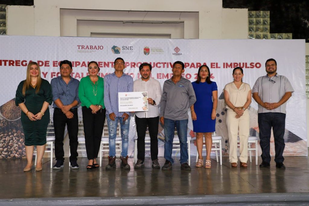 Tapachula, Chiapas.- El Ayuntamiento de Tapachula participó en la entrega de equipamiento productivo para el impulso y fortalecimiento del empleo 2024, organizado por la Secretaría de Economía y Trabajo del Estado de Chiapas, donde se beneficiaron 208 personas de 16 municipios con 120 equipamientos, con una inversión total de 5 millones de pesos.