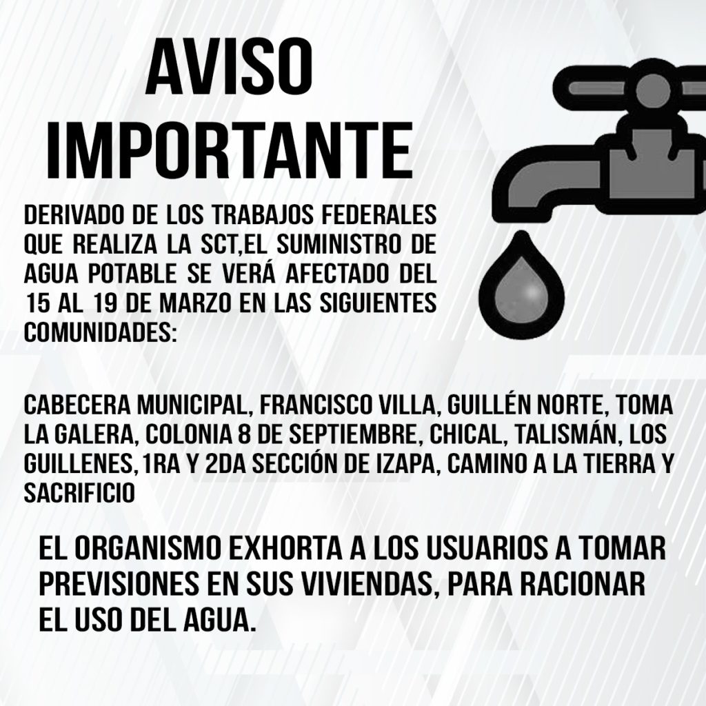 El Sistema de Agua Potable y Alcantarillado Municipal de Tuxtla Chico (SAPAM) informó que del 15 al 19 de marzo se verá afectado el servicio de agua, derivado de los trabajos federales que realiza la Secretaría de Comunicaciones y Transportes (SCT) sobre el tramo “Talismán del km 0+000 al km 0+700 lado derecho ramal a Unión Juárez”.