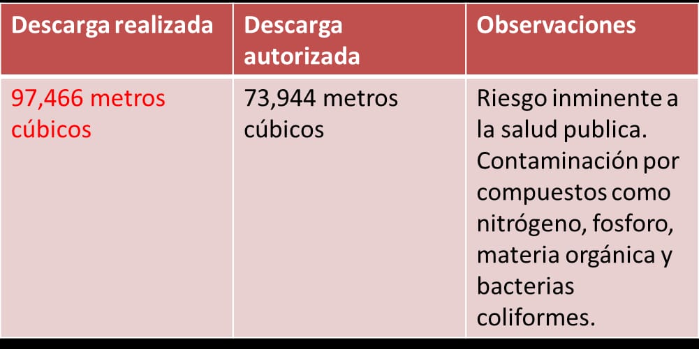 La empresa descargó un 31.81 % más de aguas residuales que lo autorizado en su permiso vigente. Esto implica un grave riesgo a la salud pública y a los habitantes de la zona adyacente.