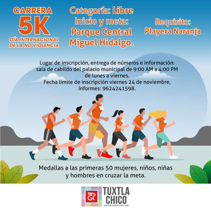 El Gobierno del Estado de Chiapas a través del Instituto del Deporte, la Secretaría de Igualdad de Género del Estado y el Gobierno Municipal de Tuxtla Chico invitan a la ciudadanía, corredoras y corredores a la segunda Carrera Estatal por una Vida Libre de Violencia.