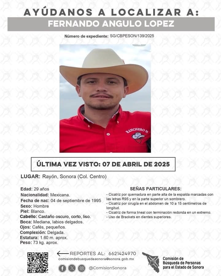 La Comisión de Búsqueda para el Estado de Sonora, en su ficha de búsqueda, pide el apoyo de la ciudadanía para localizar a Fernando Angulo López. Para brindar cualquier información de manera anónima sobre su paradero, pueden llamar al número 662 142 4970 o al número de emergencias 911.