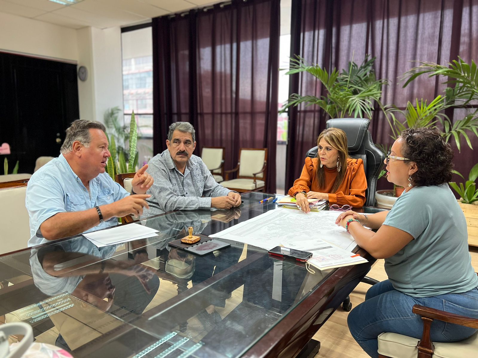 La presidenta municipal de Tapachula, Rosa Irene Urbina Castañeda, sostuvo una reunión de trabajo con los titulares de la Secretaría de Desarrollo Urbano y Ecología (SEDURBE) y Obras Públicas, Luisa Guadalupe Zamora Ayala y Andrés Santiago Martínez, respectivamente, para revisar el proyecto de instalación de contenedores de basura.